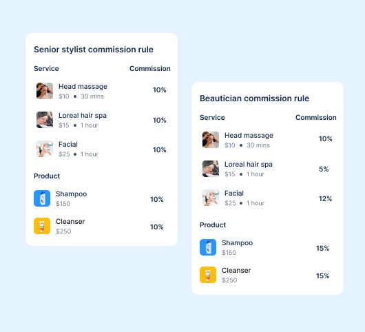 Tag staff with different commission groups. Apply for staff commissions for services, products, packages, prepaid and membership.